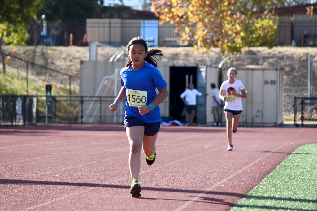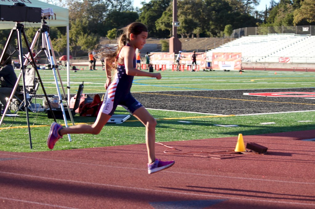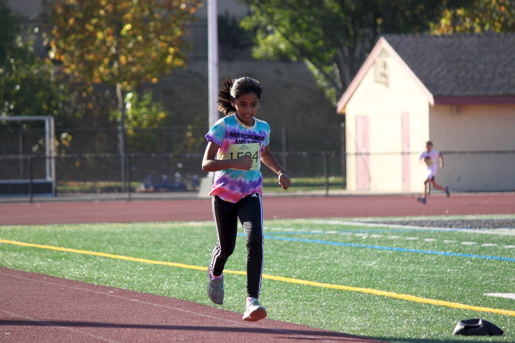 Aneri Sheth, Cheryl Chuang, and Anshika Jain finished 1, 2, 3 in heat #2 of Event #4, the 100-Meter Dash, but Melissa Auchard (pictured below) of heat #1 was the winner of the female division.